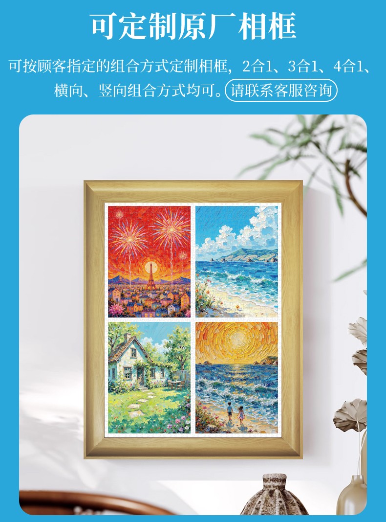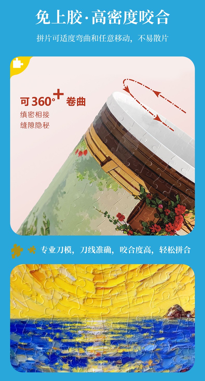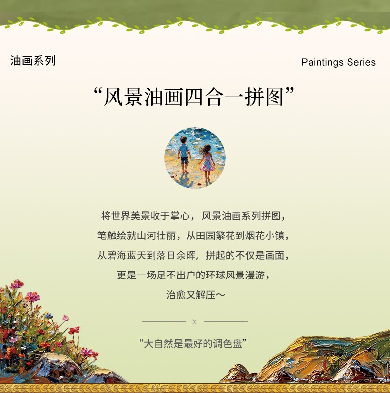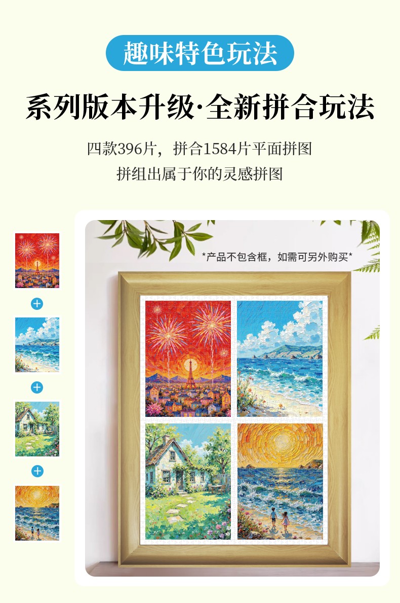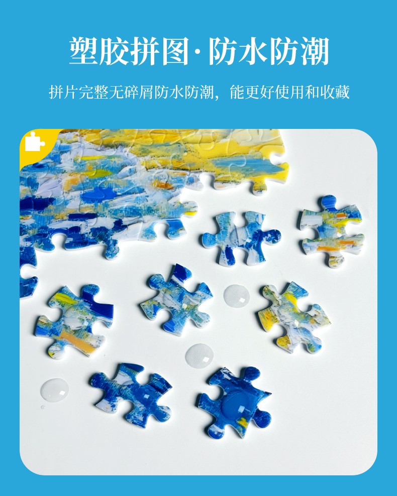 拼圖名稱:四合一塑料平面油畫拼圖 材質(zhì):塑料 拼圖尺寸:317*260mm 拼圖片數(shù):1000片 加工方式:廠規(guī)、來圖定制 單盒包裝尺寸:185*110*48mm 四合一系列套裝:205*185*110mm